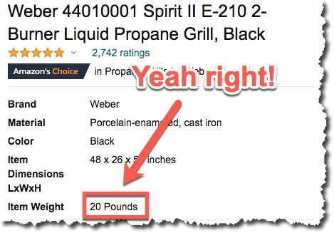 Another problem is that Amazon weighs just 20 pounds when it’s more like 100 lbs.